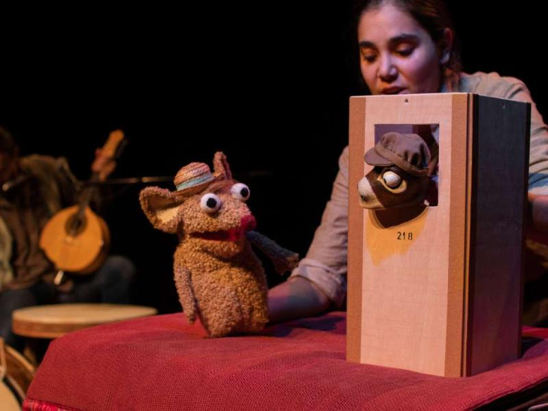 A peça é apresentada por uma atriz, que recorre a diversas técnicas tradicionais do teatro de marionetas e por um músico, que toca uma variedade de instrumentos musicais e brinquedos sonoros. - Historioscópio - Teatro de Marionetas