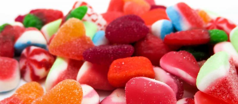 Sopa, fruta, Bolo à fatia, gomas e sumos.
