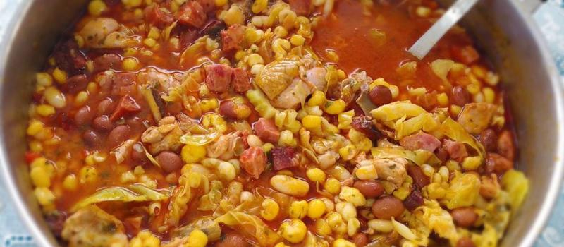 Cachupa de carne; Grogue de Cabo Verde (Aguardente de cana).