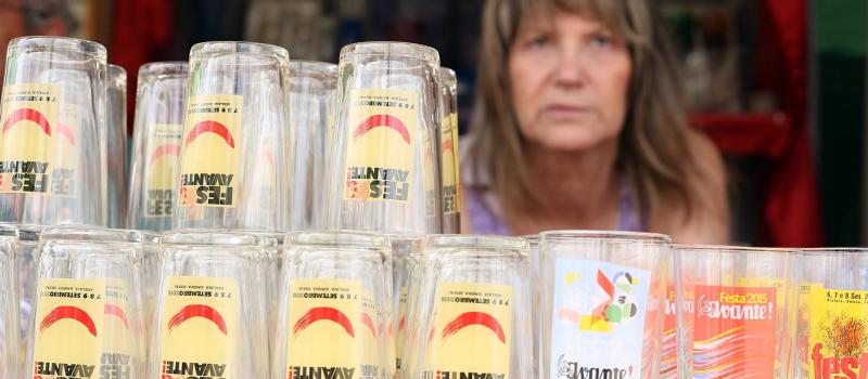 PEdição do Copo da 48a Festa do Avante!. Peças artesanais em vidro da Marinha Grande. Vinhos do Bombarral, Ginja de Alcobaça, Ginja de Óbidos.